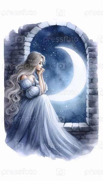 Принцесса, смотрящая на звезды в башне акварельный художественный печат, Ai generated image