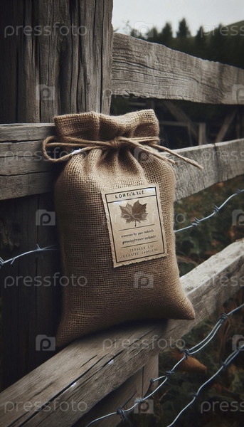 Мокет мешкообразного мешка с пустой маркировкой из прессованных листьев и веревки, опираясь на деревянный столб ограждения, Ai создал изображение