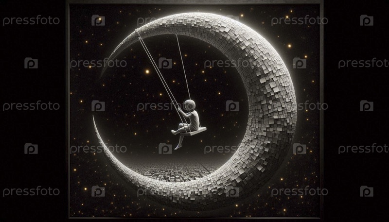 Ребенок, качающийся на полумесяце над городом, Ai generated image