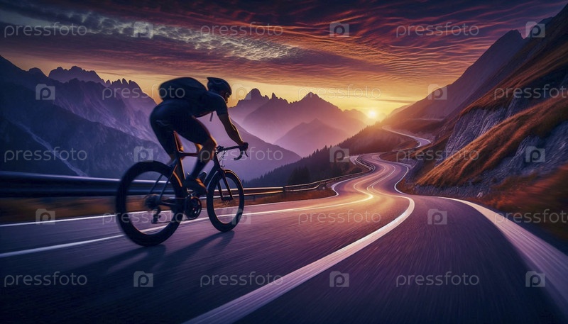 Приключенческий велосипедист покоряет извилистую горную дорогу на закате, оглядываясь назад, Ai generated image