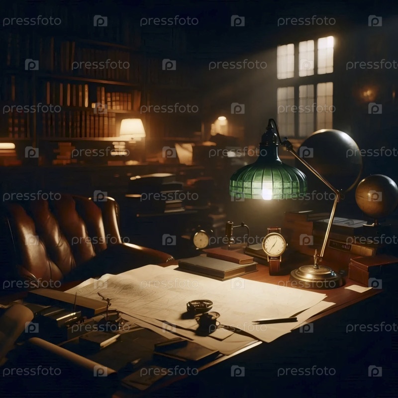 Более широкий снимок слабо освещенного кабинета с часами в фокусе, созданный изображением Ai