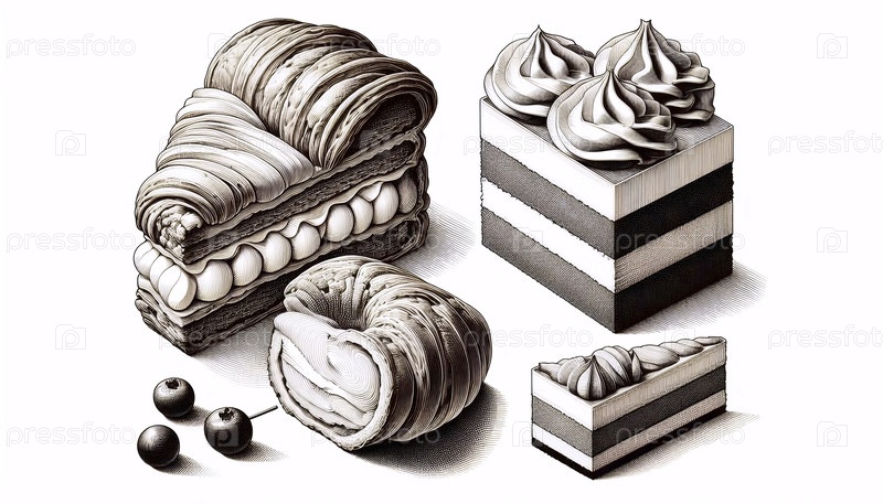 Exquisite Pastry ink Drawing An art print, Ai generated image Искусственный печатный рисунок с чернилами для вышивки пирогов