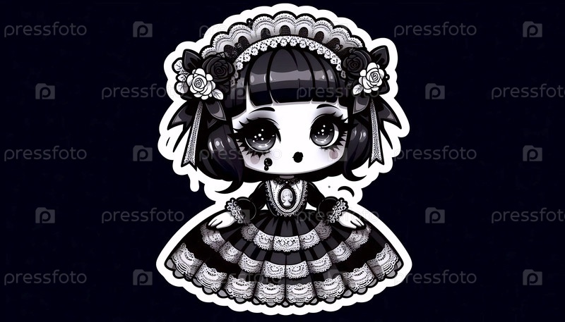 Милый стикер кавайи на готическую фарфоровую куклу Лолита, Ai generated image