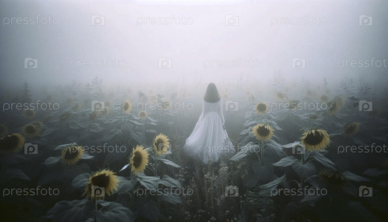 Женщина в белом среди туманного поля подсолнечника, Ai generated image