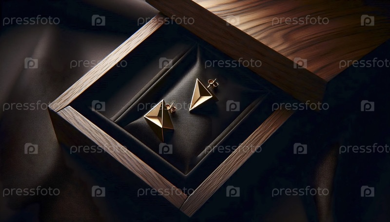 Пара пустых геометрических золотых серёжек с макетными спинками помещены в отдельные сатинные отсеки на тарелке для ювелирных украшений из темного грецкого ореха, Ai generated image