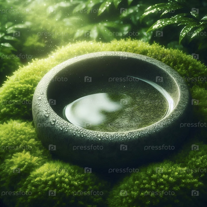 Мокет неглубокой каменной чаши с водой для созерцания, в ложе моха, Ai generated image