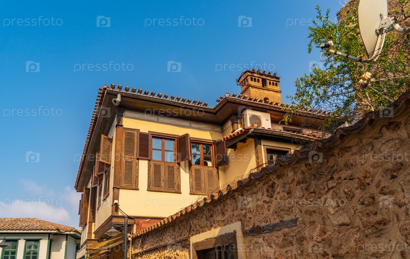 Вид на фасад дома с деревянными рамами и черепичной крышей. Исторический район Анталии, Турция