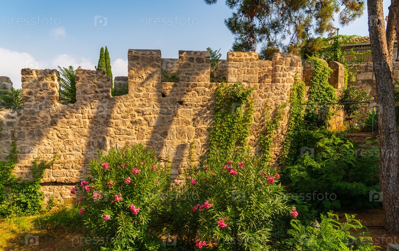 Каменная стена с зелеными растениями и цветущим олеандром в курортном парке.Исторический район Анталии, Турция