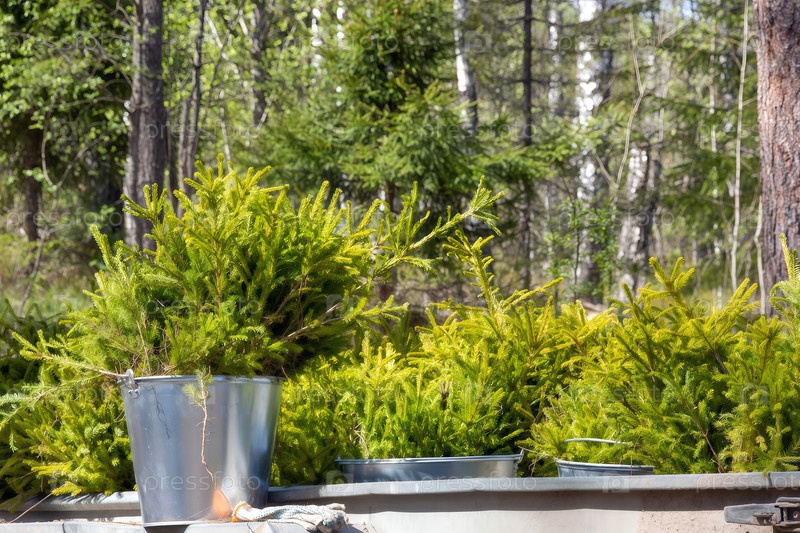 Саженцы ели обыкновенной в ведрах для посадки и лесовосстановления на участках после вырубки, пожаров и ветровалов