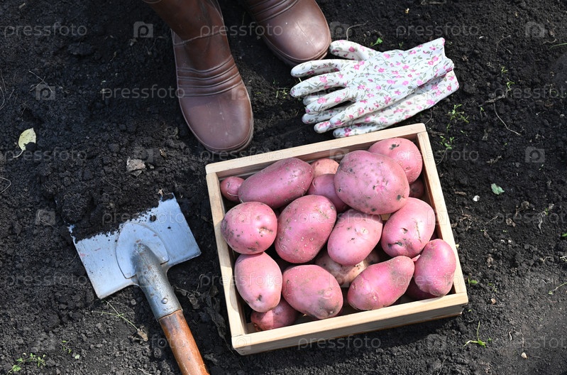 Человек стоит на темной почве рядом с деревянным ящиком, заполненным свежими картофелями. Рядом садовые перчатки и лопата. Эта сцена показывает процесс сбора урожая