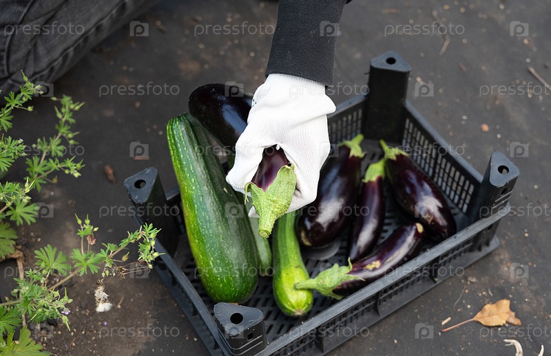 Яркий садовник с гордостью демонстрирует коллекцию свежесобранных, ярких баклажанов в пышном зеленом саду