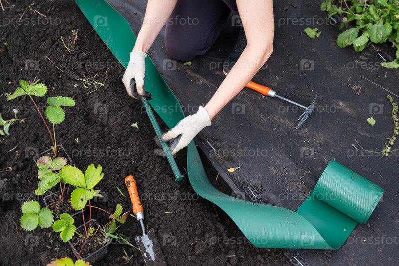 Женщина ставит пластиковый бордюр на садовую кровать в качестве забора