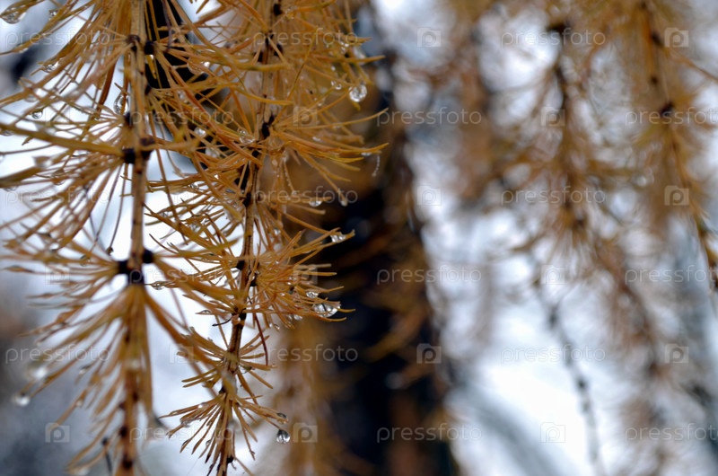 Крупный план ветки лиственницы с желтой хвоей и каплями дождя