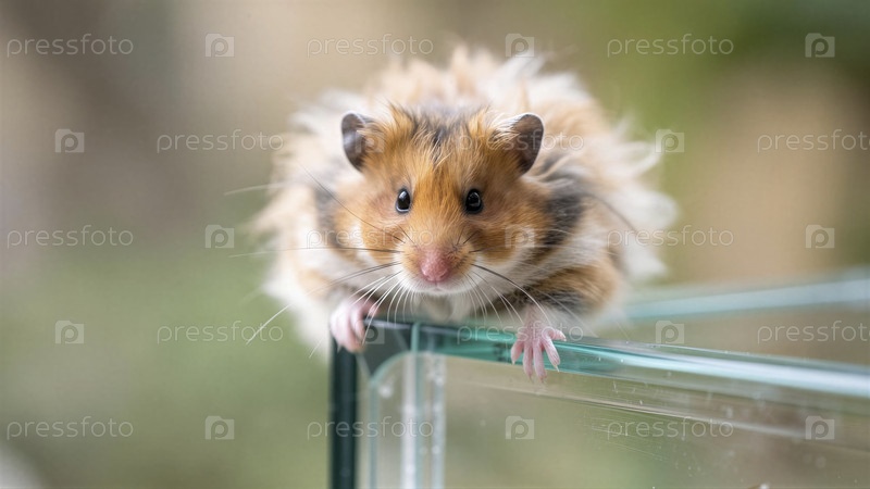 Очаровательный пушистый хомстер, опирающийся на стекло