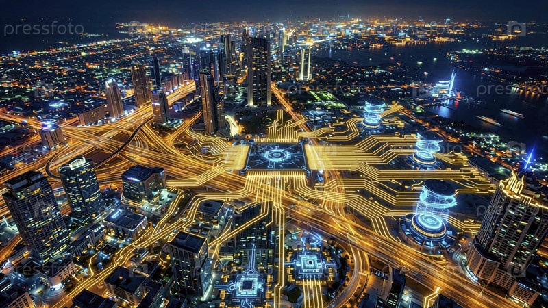 Футуристический городской пейзаж с дизайном интегрированных цепей