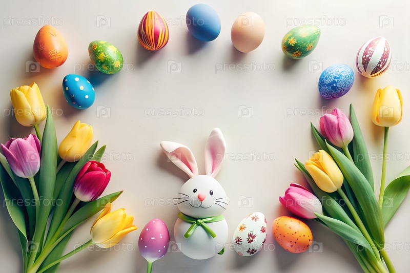 Пастельные пасхальные яйца, тюльпаны и милое украшение кролика на светлом фоне, весенние праздники плоская композиция. g