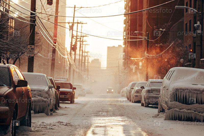 Замороженная улица после ледяной бури с автомобилями и домами, покрытыми льдом зимой в Канаде или США