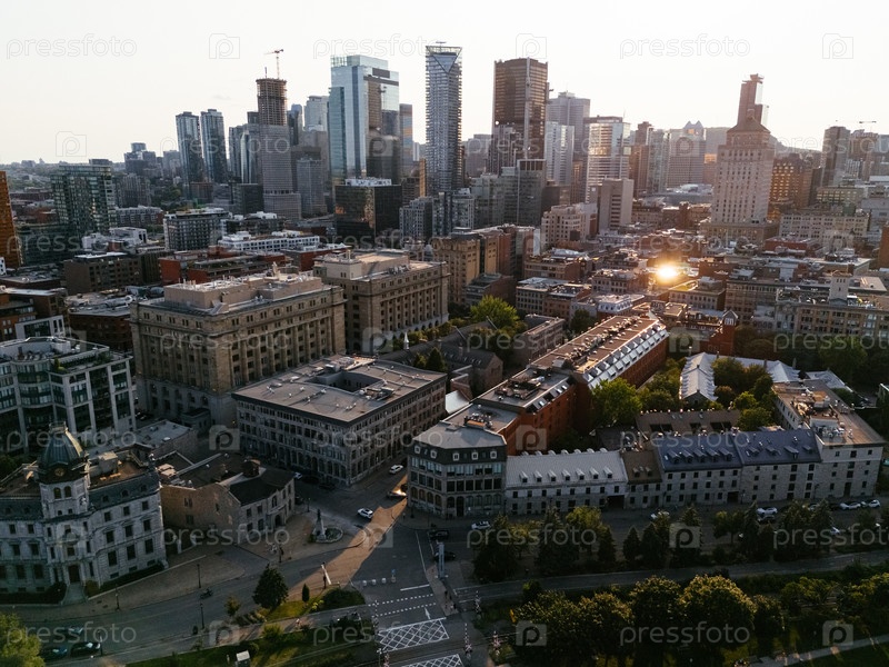 Монреаль на закате с городскими небоскребами, рассматриваемыми из старого порта
