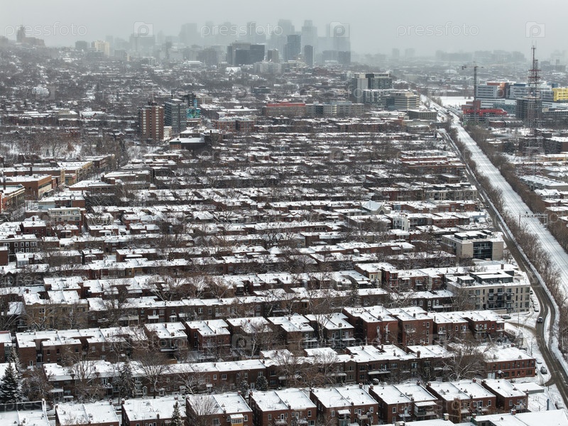 Зимний вид с воздуха снежными жилыми крышами и кирпичными домами в городском районе Монреаля, Квебек, Канада. g