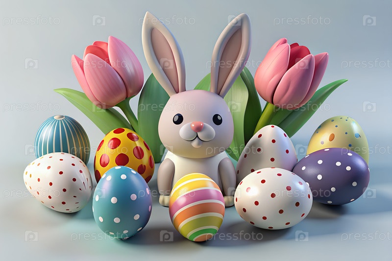 Пастельные пасхальные яйца, тюльпаны и милое украшение кролика на светлом фоне, весенние праздники плоская композиция. g