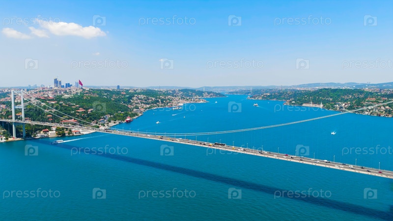 Панорамный вид Босфорского пролива с горизонтом города и достопримечательностями в яркий солнечный летний день