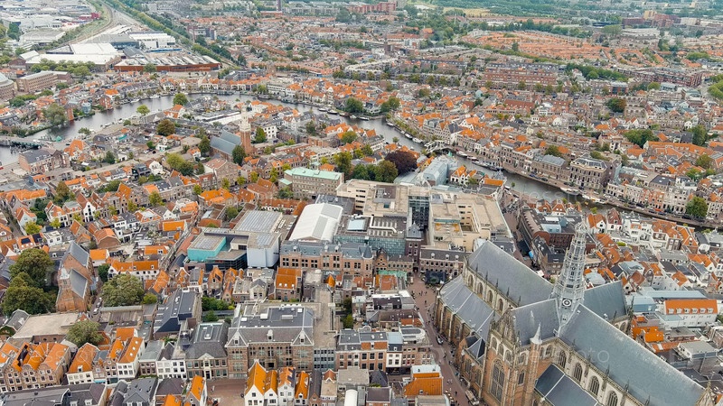 Церковь Святого Баво - готический храм Панорамный вид на центр города Haarlem Облачная погода в течение дня Летом, Aerial View