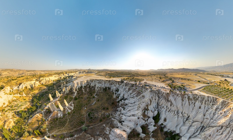 Широкий панорамный вид с горы Любителей на долину любви, волшебные дымоходы и окружающий ландшафт Каппадокии в теплом свете заката