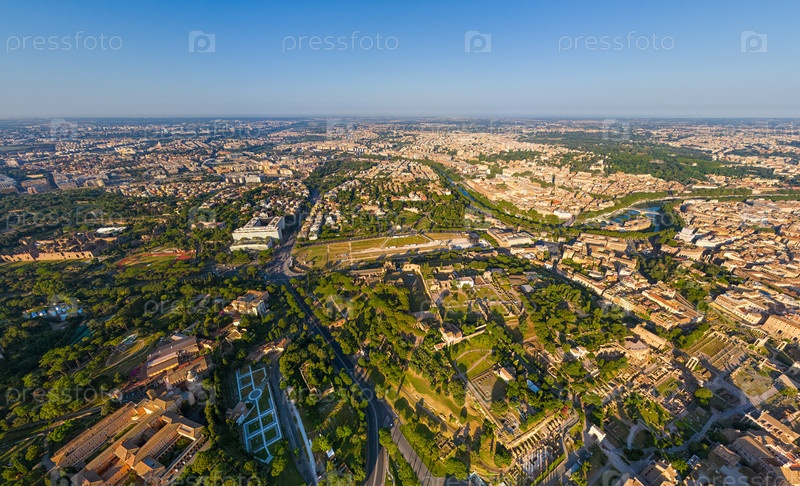 Рим, Италия. Исторический центр. Город в пределах досягаемости. Панорама города летом утром. Вид с воздуха