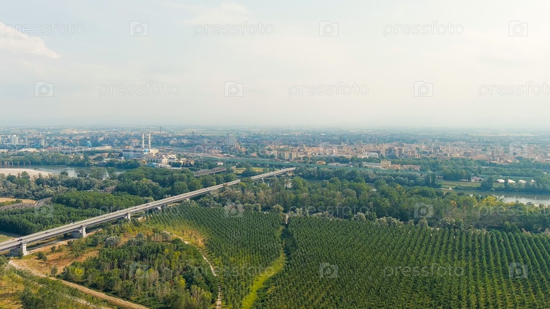 Пьяченца, Италия.Полет над полями.Река По.Летний день, Aerial View