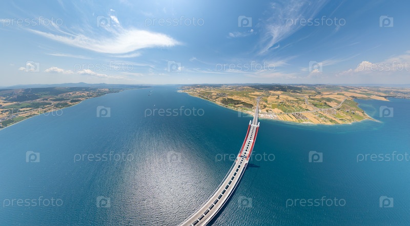 Панорамный вид из воздуха на Дарданелльский пролив от Лапсеки до Гелиболу с мостом, шоссе, полями и морским движением на горизонте