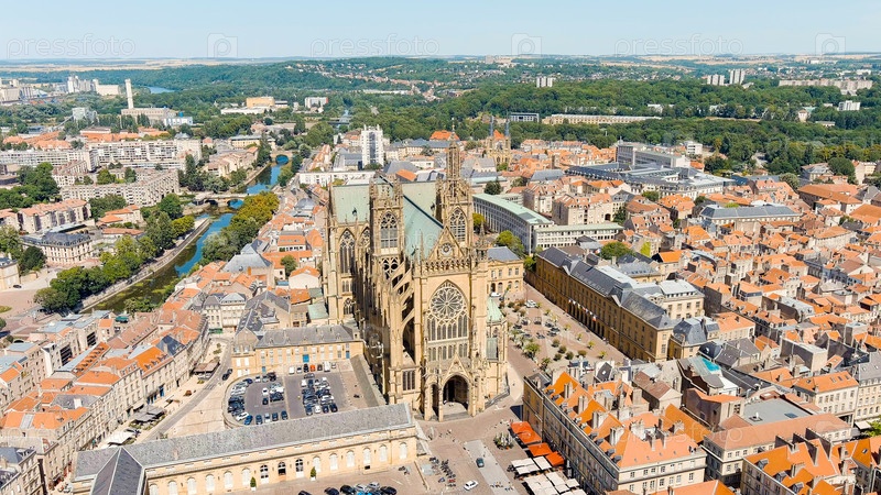 Метц, Франция. Собор Меца. Вид на исторический центр города. Лето, солнечный день, Aerial View