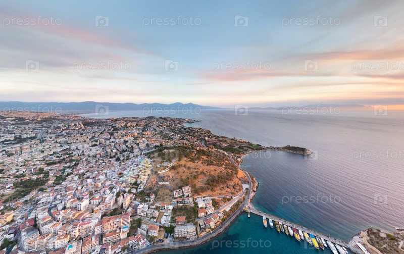 Кусадаси, Турция.Взгляд с воздуха подчеркивает особенности горы Кесе при закате солнца.Горный пейзаж со знаком города, светящимся в вечернем свете.Вид с воздуха
