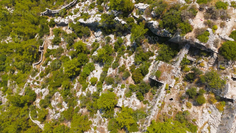 Какалар, Аланья, Турция. вид древнего крепостного замка Алара с помощью беспилотных летательных аппаратов руины на вершине горы с видом на живописный ландшафт речной долины