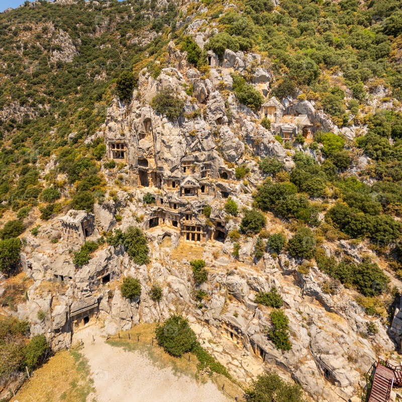 Детальное воздушное обследование древнего ликийского некрополя, высеченного в скале и демонстрирующего погребальные камеры и архитектурные детали
