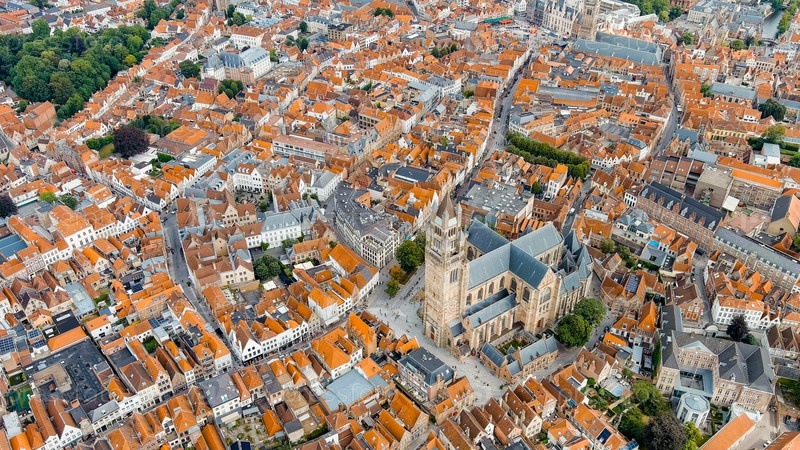 Брюгге, Бельгия. собор Святого Сальватора - собор XIV века с готической башней. панорама центра города из воздуха. облачная погода, летний день, Aerial View