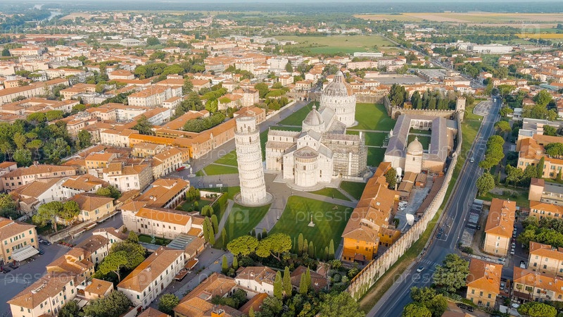 Пиза, Италия. Знаменитая наклонная башня и пизанский собор в Пьяцце деи Мираколи. Лето. Утренние часы, взгляд с воздуха