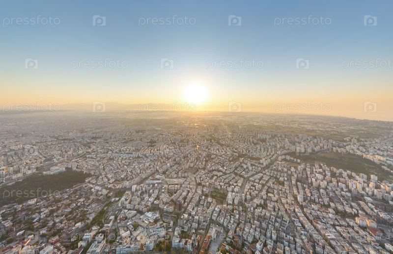 Анталия, Турция.Перспектива воздушного дрона, захватывающая плотный архитектурный силуэт и разнообразные крыши современного города в утреннем солнечном свете