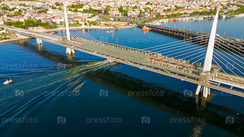 Паром общественного транспорта, проходящий под мостом метро "Золотой рог" в заливе Золотого Рога на утреннем солнце