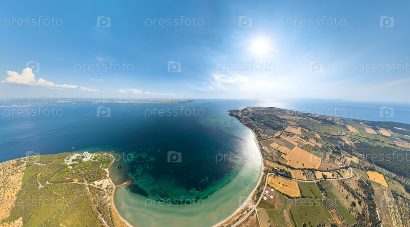 Панорама с воздуха, демонстрирующая Мемориал мучеников Чанаккале, историческую крепость Седульбахир и французское кладбище на полуострове Галлиполь в бухте Эртугрул