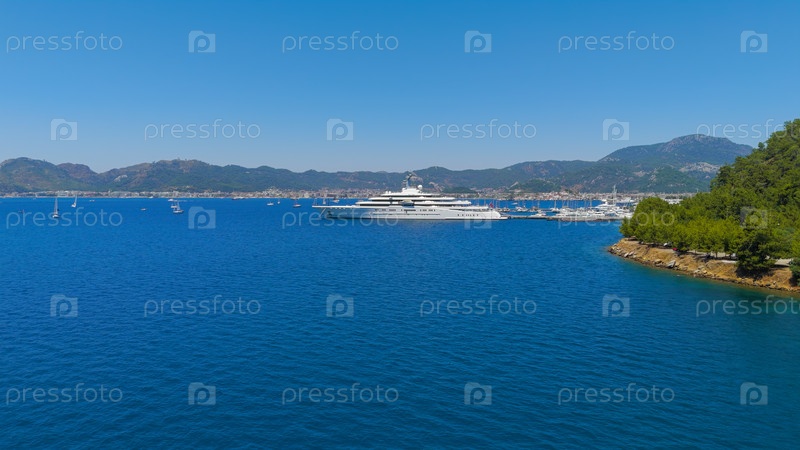 Панорамные воздушные снимки дрона роскошной яхты в красивой марине на турецкой Ривьере яркий солнечный летний день, лодочная и туристическая концепция