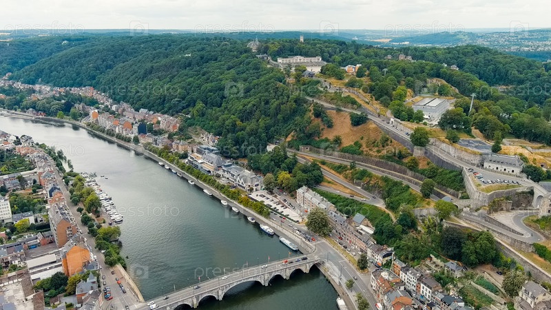 Цитадель Де Намур - крепость 10-го века с парком, несколько раз перестраивалась. Панорама центральной части города. Река Маза. Летний день, Aerial View Nam