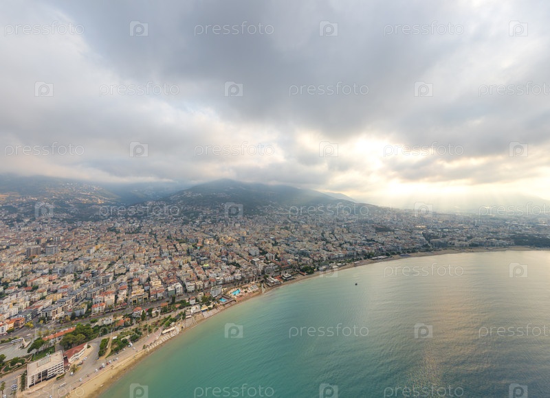 Вид с воздуха на длинный пляж Кейкубат, простирающийся до горизонта вдоль средиземноморского побережья с солнечными лучами через облака над морем
