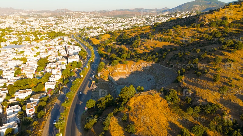 Бодрум, Турция.Панорама древнего театра в Бодруме с использованием беспилотника на холме Гоктепе.Ошеломляющий вид на город Бодрум, береговую линию и Эгейское море.Воздушный взгляд