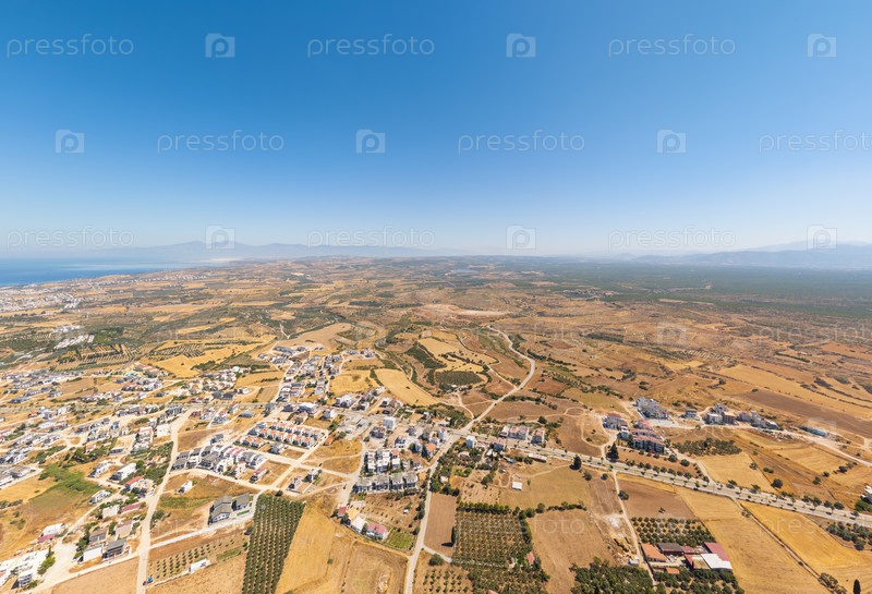 Дидим, Турция.Взгляд с беспилотника на землю, встречающуюся с морем с красочными полями, городскими улицами и горным видом.Вид с воздуха