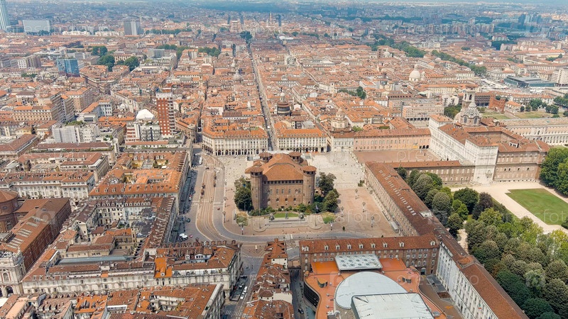 Турин, Италия. Замок Палаццо Мадама. Площадь Пиацца Кастелло. Панорама города. Летний день, Aerial View