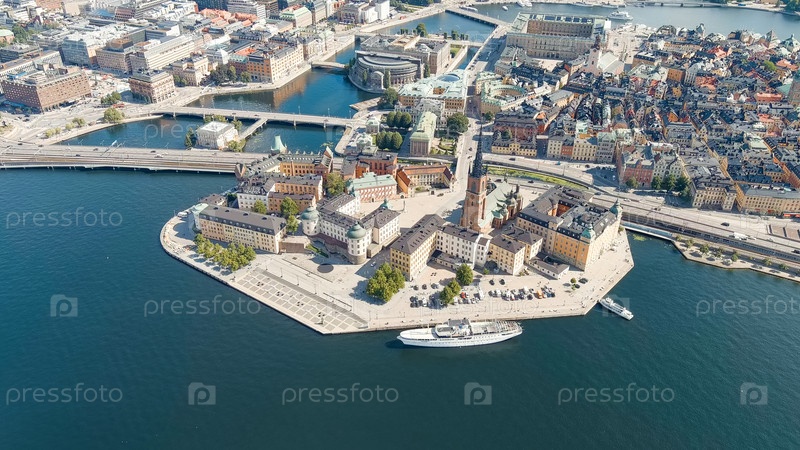 Стокгольм, Швеция. Остров Риддархольмен и озеро Маларен. Церковь Риддархольмена. Панорама города. Летний день, взгляд с воздуха