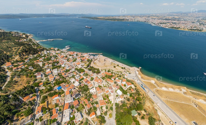 Вид с воздуха исторического Дарданелльского пролива со замком Килитбахир, с видом на морской трафик грузовых и паромных судов вблизи города Чанаккале