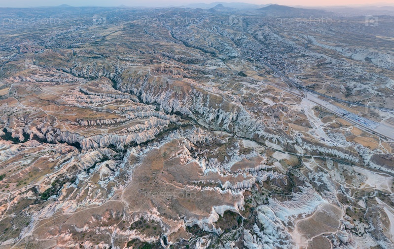Панорамный взгляд с воздуха на плато Каппадокии, вырезанное долинами с розовыми скальными образованиями и темно-зелеными лентами растительности вдоль водных путей