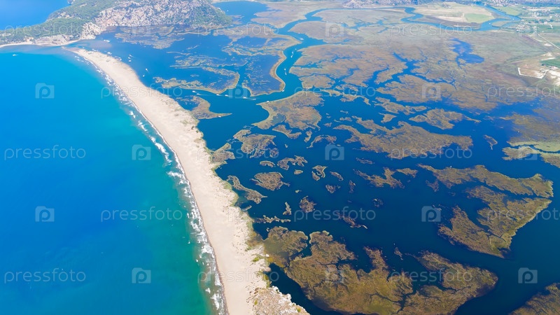 Вид с беспилотного летательного аппарата на пляж черепахи Изтузу, где река Далян впадает в Средиземное море, показывает золотую песчаную струю, каналы и волны