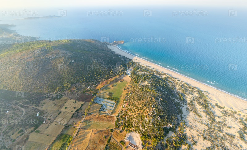Расширенный утренний вид на береговую линию пляжа Патара, демонстрирующий обширные песчаные дюны, средиземноморские морские волны и летнее небо в полной живописной детализации